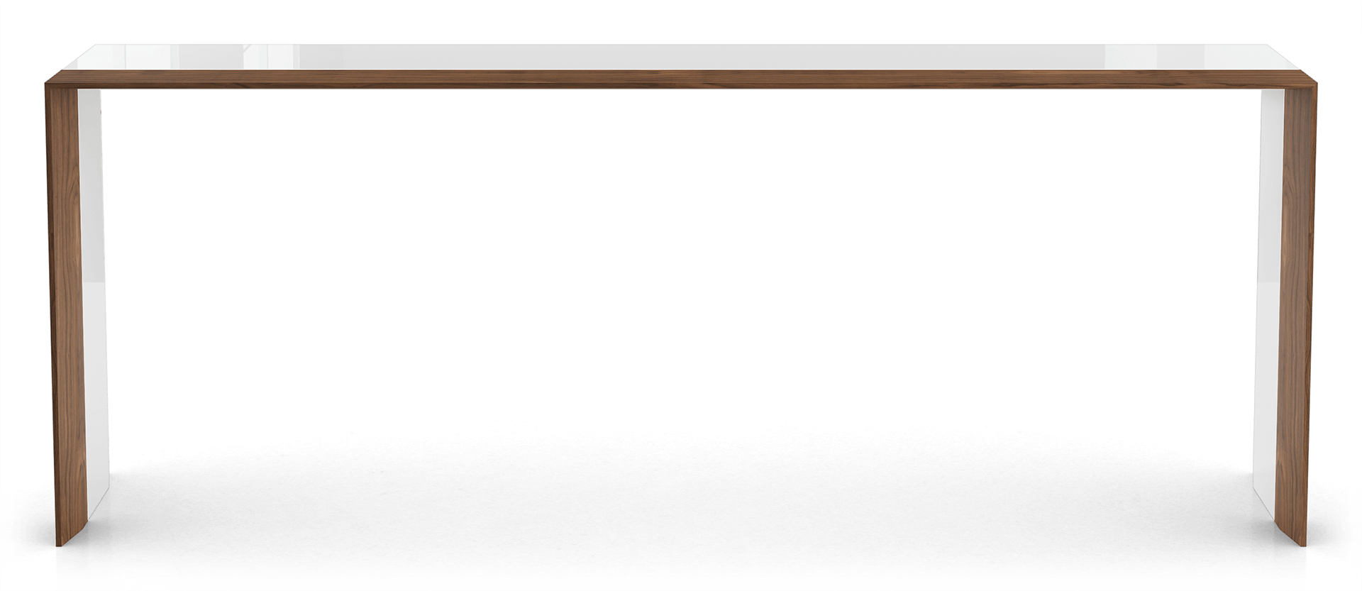 A high-gloss lacquer serves as the console's primary finish, while a natural wood accent scored with grooves for added detail adds an intriguing contrast to the piece. Matching occasional tables available.