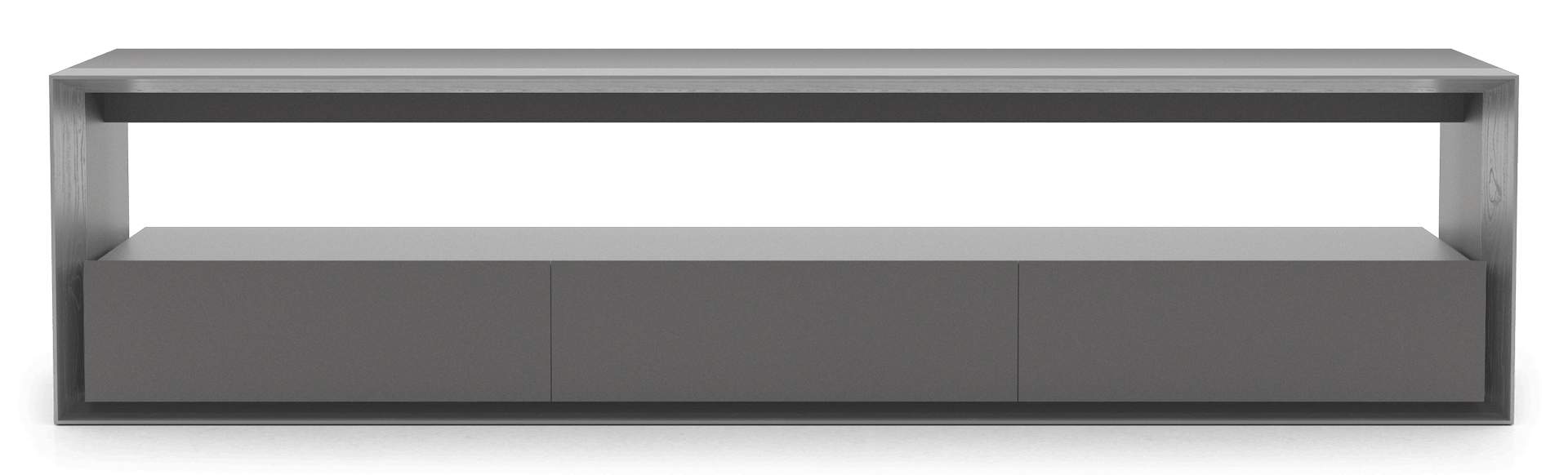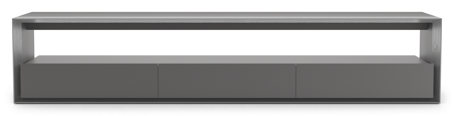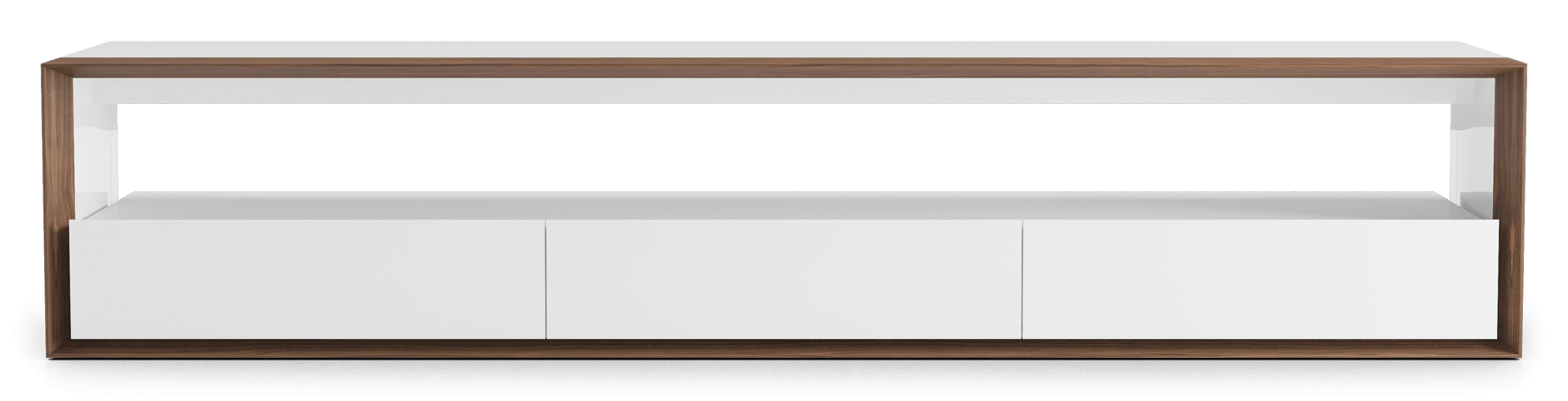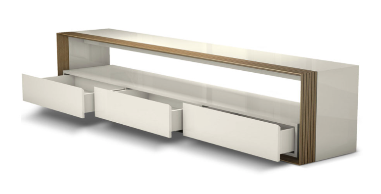 Wood and lacquer finishes tastefully exemplify modern warmth. An ultra-thin profile whispers sophistication. Seamlessly mitered edges and routed wood scoring refine the overall ambiance. Three full-extension drawers and an elongated shelf offer oft-needed storage space.