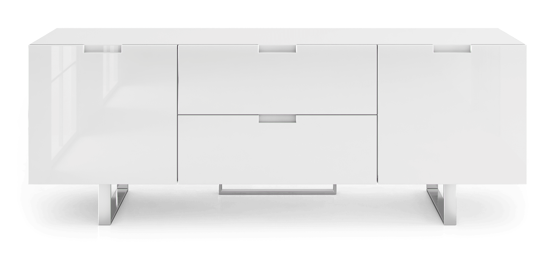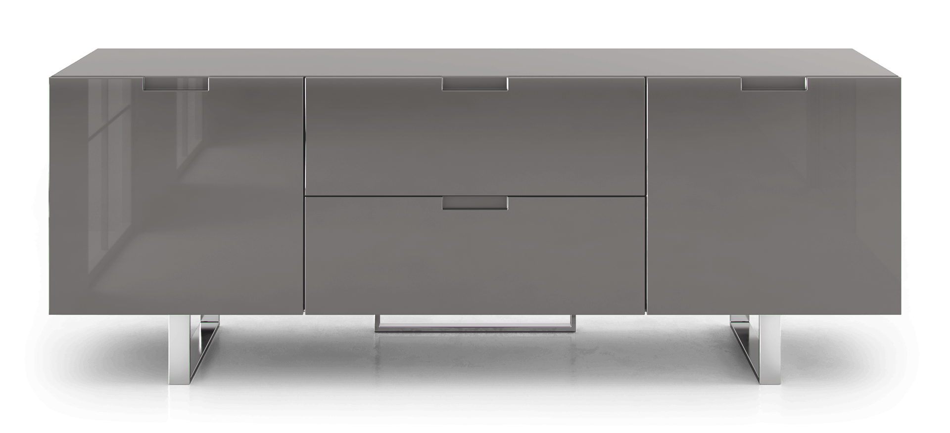 Supported on two polished steel legs, cabinet features two center drawers and two side cabinets offering plenty of storage room. Smooth, soft-closing cabinet doors open to A/V-ready compartments complete with adjustable vented middle shelves providing air circulation. The back of the unit features sliding doors and cutouts to easily get to your components and manage the cables.